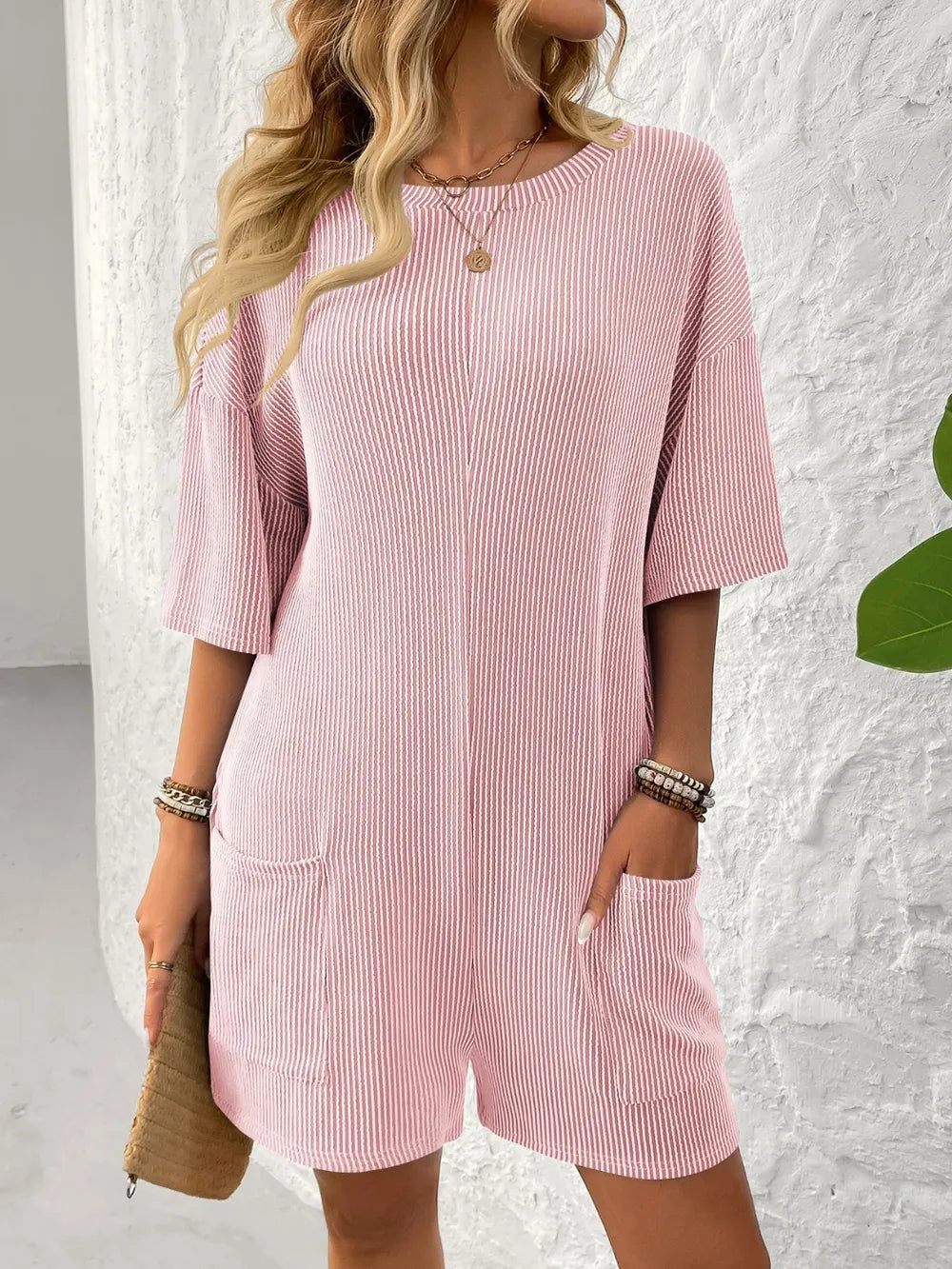 Backless Textured Round Neck Half Sleeve Romper