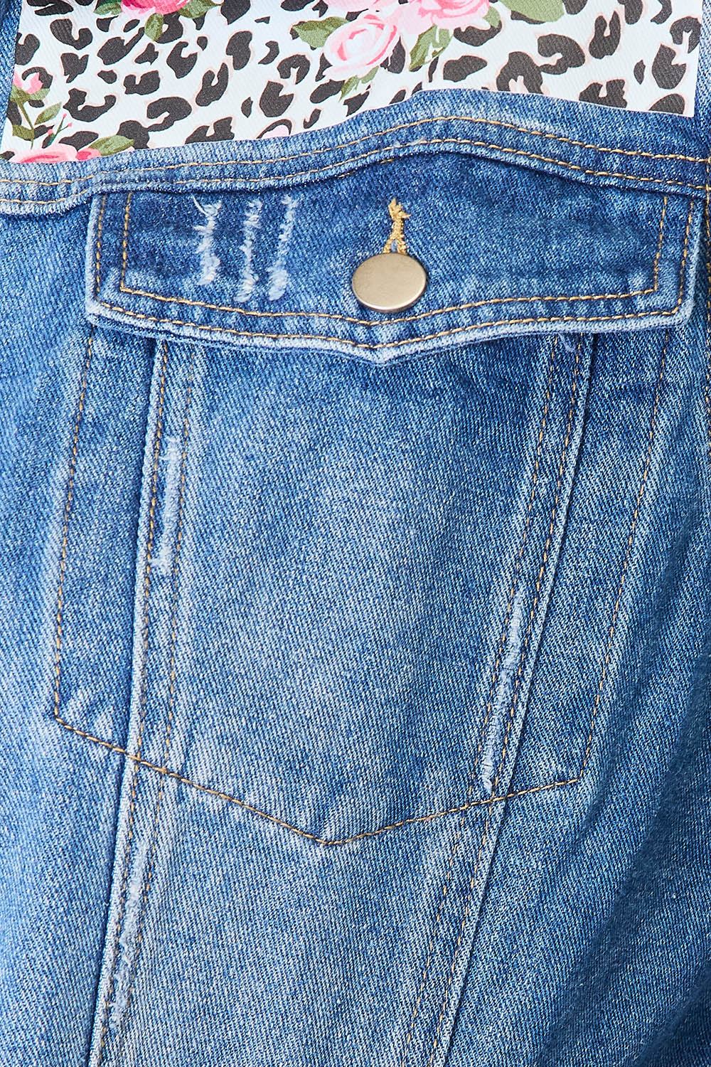 The Leopard Floral Distressed Raw Hem Denim Jacket effortlessly combines edginess and femininity. This jacket adds a bold statement to your outfit with its unique leopard print and floral pattern. The distressed details and raw hem give it a trendy and vintage-inspired look, making it a versatile piece worn with casual and dressy ensembles. Stand out from the crowd with this fashionable and eye-catching denim jacket.