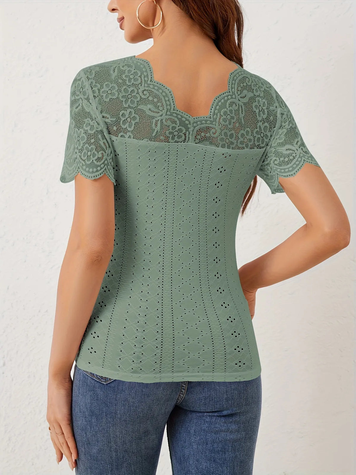 Lace Scalloped V-Neck Eyelet T-Shirt
