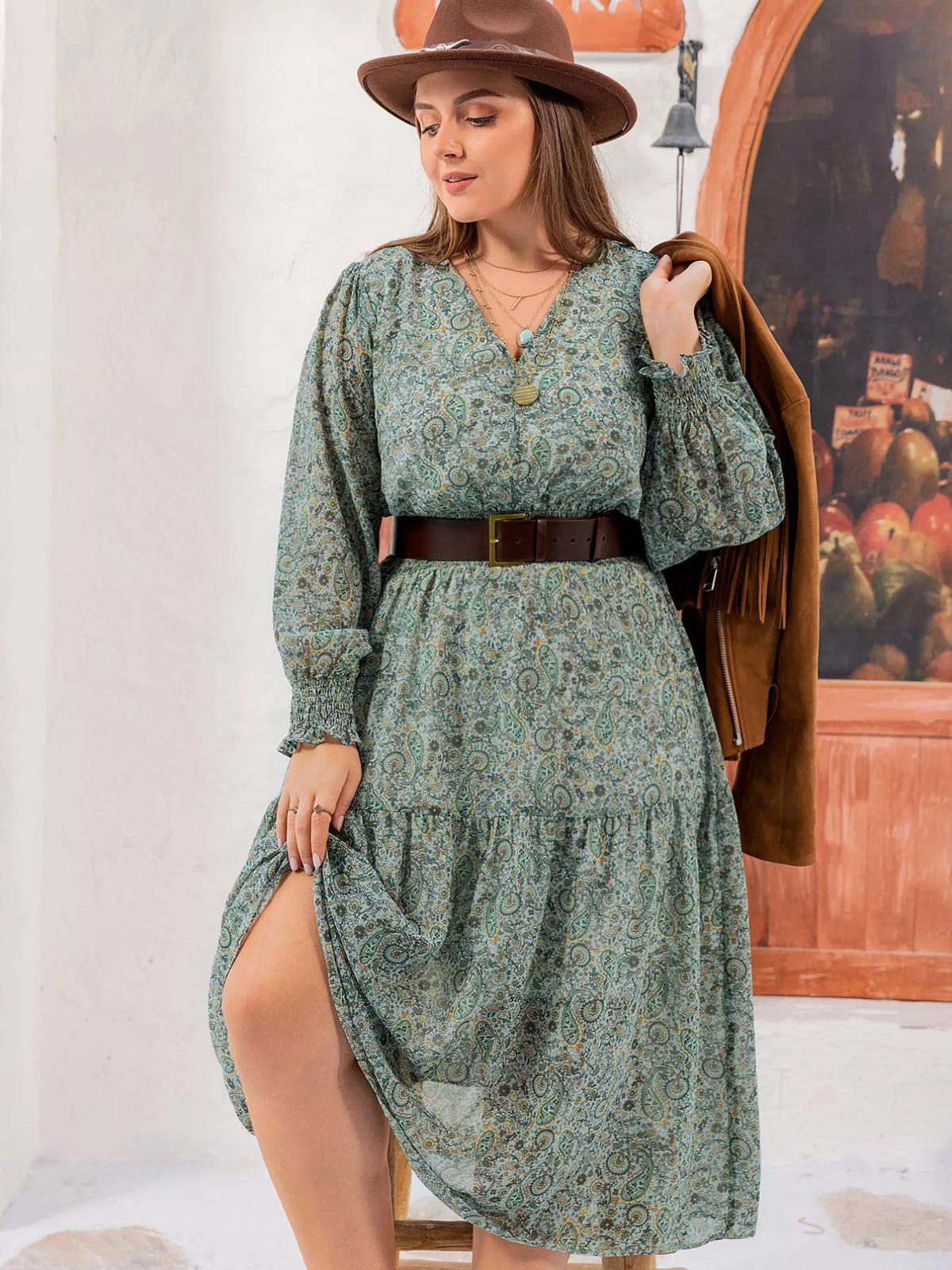 Plus Size Printed V-Neck Long Sleeve Midi Dress