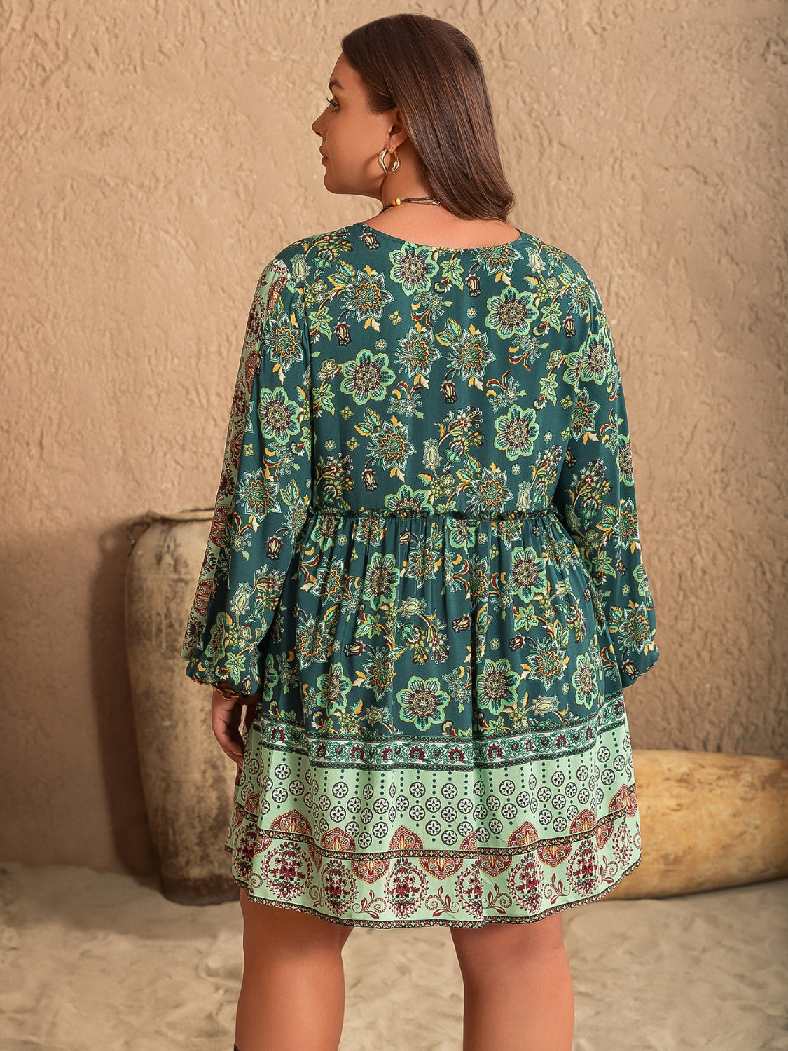 Plus Size V-Neck Balloon Sleeve Printed Mini Dress