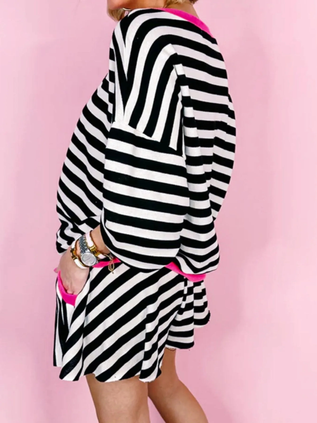 Stripe Contrast Ribbed Banding Long Sleeve Blouse and Loose Shorts Set