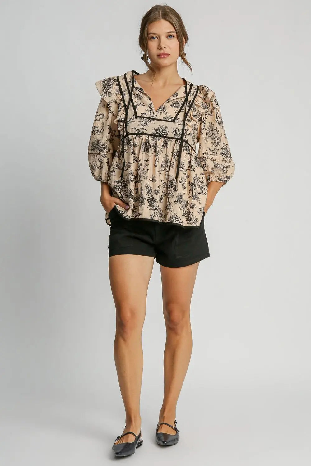 Umgee Ruffled Tie Neck Puff Sleeve Babydoll Blouse