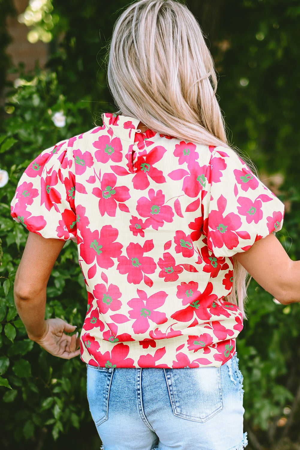 Beige Floral Puff Sleeve Frilled Neckline Blouse