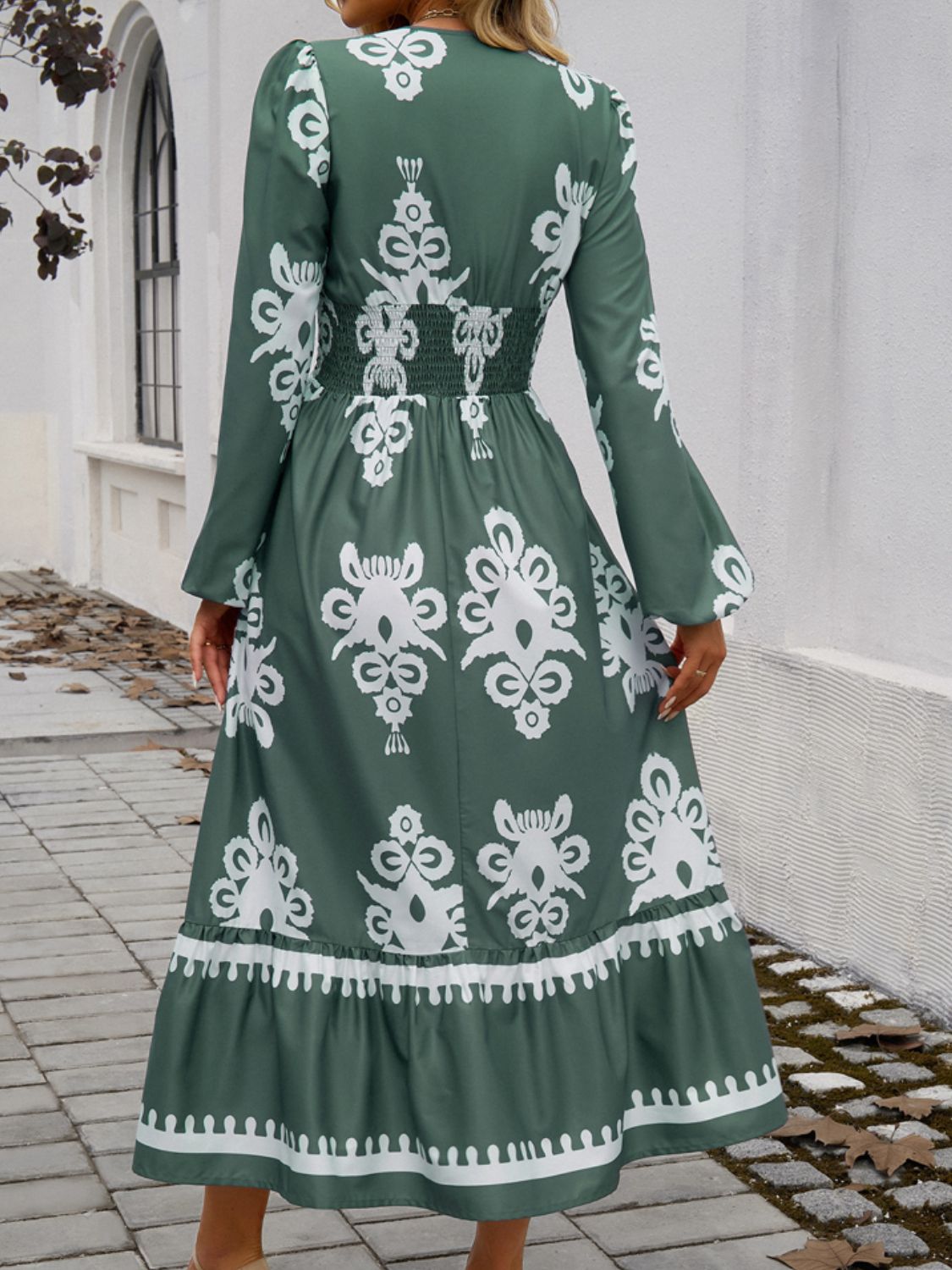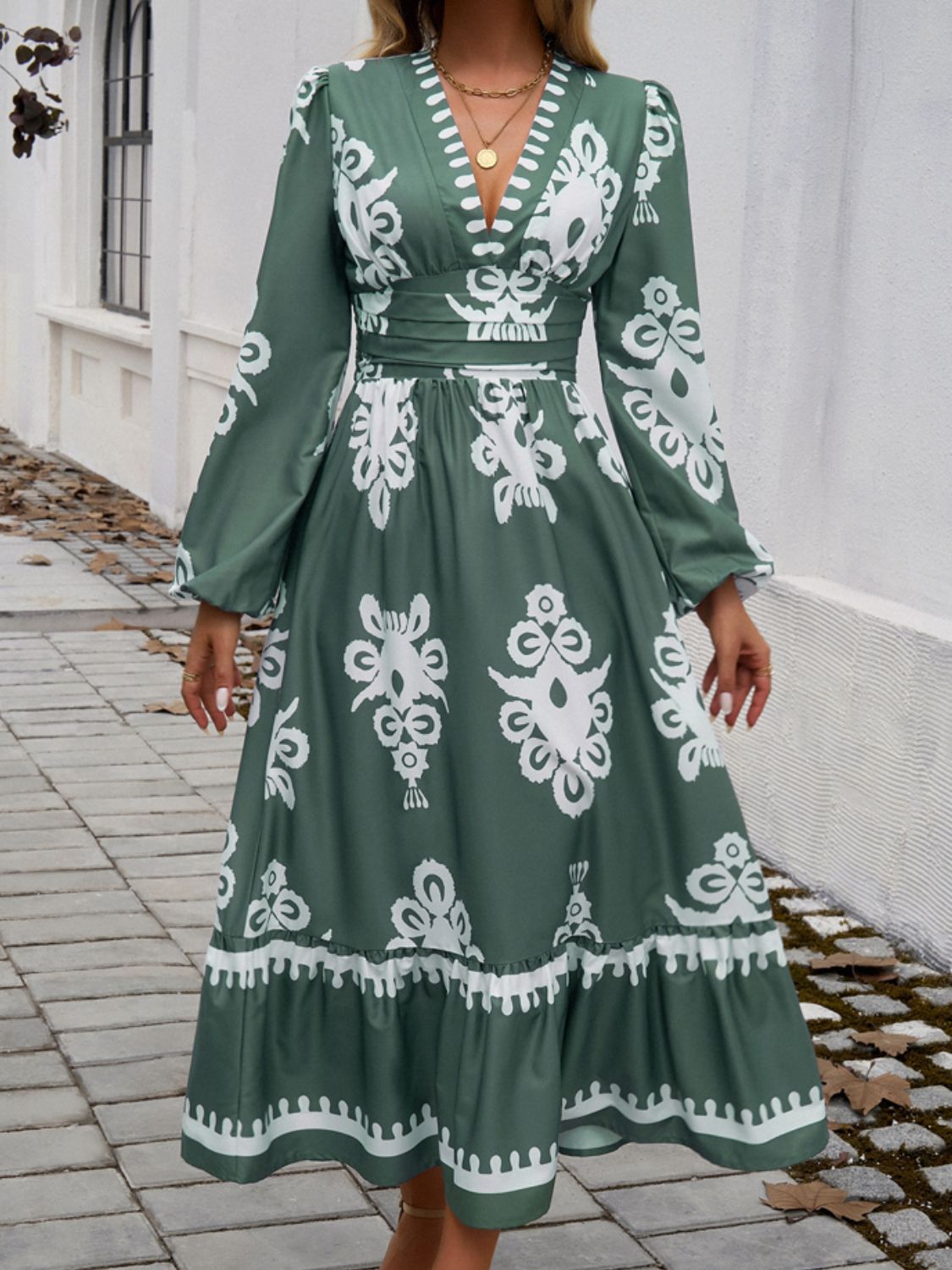 Devine Ruffled Printed Plunge Long Sleeve Dress